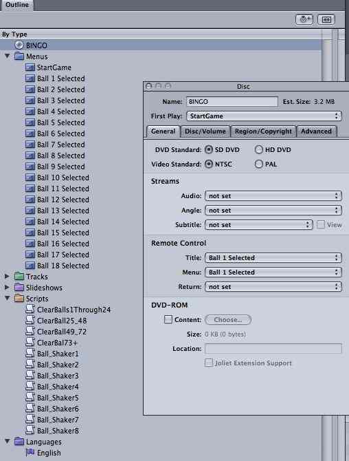 This is the set up of the disc, I only did the first 18 menus (Ball 1 through Ball 18 Selected) I set the first play to a menu called StartGame (better to start a DVD with jump to a track of even a few seconds of black prior to going to a menu as a general rule, and then set that to a menu.)