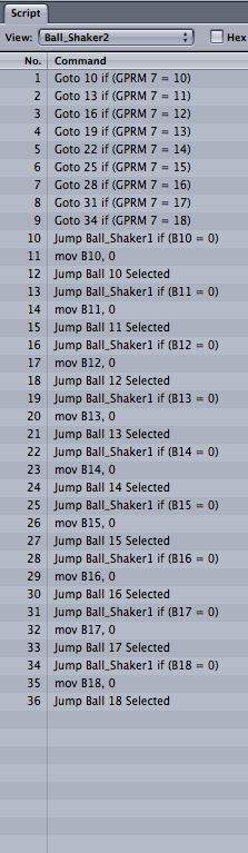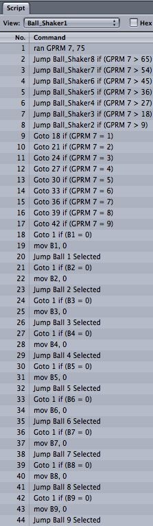 Ball Shaker 1 in line 1 makes the Random, 2-8 routes to the other scripts based on the random values. Line 18, for instance, generates a new random if B1 is 0 (previously used), else it sets it to 0 (line 19) then goes to the Ball 1 Selected Memnu (Line 20) I also did a fuller mark up of Ball_Shaker 2 because that is where it may have been confusing. Lines 1 thorugh 9 send the script to based on the values. So if the random number is 11, the script jumps to line 13 (from line 4) Line 13 is where the issue is, it needs to go back to ball shaker 1 if 13 was pulled already. Ballshaker 3 and up will be the same as Ballshaker 2 but the values need to be adjusted to the proper numbers.